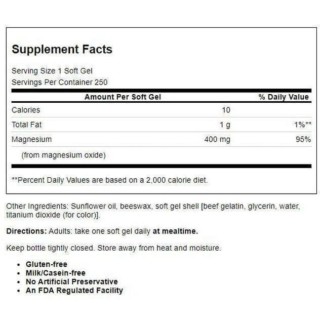 Carlson Labs Liquid Magnesium 250 Soft Gel Carlson Labs Liquid Magnesium provides 400 mg of Magnesium from Magnesium Oxide in each soft gel. Magnesium is involved in normal energy production, muscle contractions, and strong bones. Magnesium aids Calcium utilization. Magnesium is an essential mineral to the human body. It is needed for bone, protein, and fatty acid formation, making new cells, activating B vitamins, relaxing muscles, clotting blood, and forming adenosine triphosphate.
