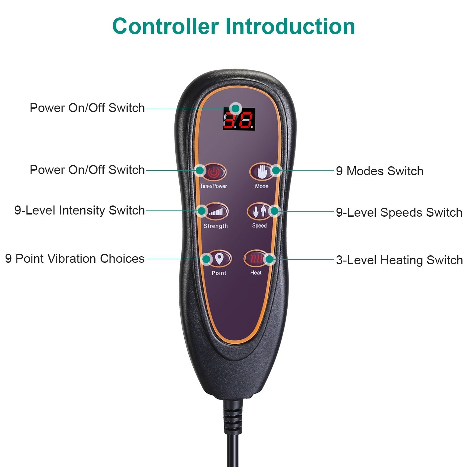 Function: Heating, Vibration(9Modes + 9 Point Vibration), Timer[Auto(10Mins)/20Mins/ 30Mins]