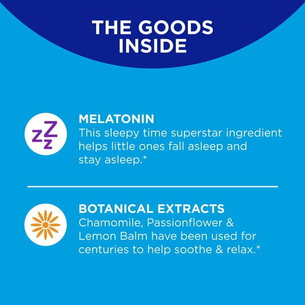 Kiddos thrive on routine so troublesome bedtimes can be a real setback. This mild blend is just the thing to help calm and settle on those occasional restless nights.* OLLY Kids Sleep gummies deliver a mini dose of Melatonin to support healthy sleep cycles and help little ones get restful sleep. We boosted it with L-Theanine and a botanical blend—Chamomile, Passionflower & Lemon Balm have been used for centuries to help soothe and relax. Sweet dreams, little one.* Good health is at the center of everything we do. That's why we’ve made it our mission to make nutrition easy to understand. We do it by crafting products that are as effective as they are delicious—because we know when something feels good, you’re more likely to do it.* *These statements have not been evaluated by the Food and Drug Administration. This product is not intended to diagnose, treat, cure or prevent any disease. For occasional sleeplessness. CAUTION: Melatonin may cause drowsiness or sleepiness; do not use when driving, operating machinery, or engaging in any activity that requires alertness. This product is not intended to treat insomnia or other sleep disorders.