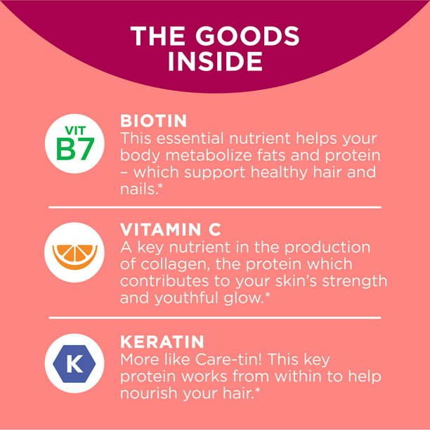 OLLY Undeniable Beauty vitamins are packed with active ingredients that help keep your hair and nails in tip-top shape and your skin shining bright.* Expertly blended, these bite-sized beauty gummies deliver Biotin, Vitamins C & E and Keratin. Biotin helps your body metabolize fats and protein to support healthy hair and nails. Vitamin C is an important nutrient in the production of collagen (the protein that contributes to your skin's strength and youthful glow) and Keratin helps nourish your hair.*