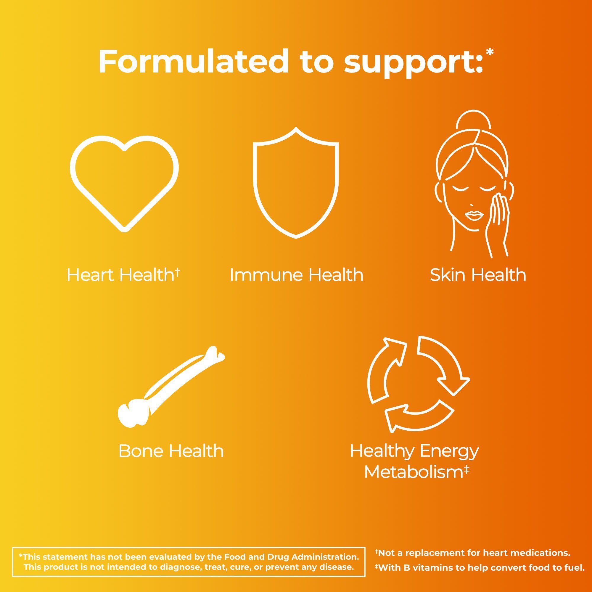 One A Day multivitamin formulated to support bone health; immune health; skin health; heart health; and physical energy by helping convert food to fuel